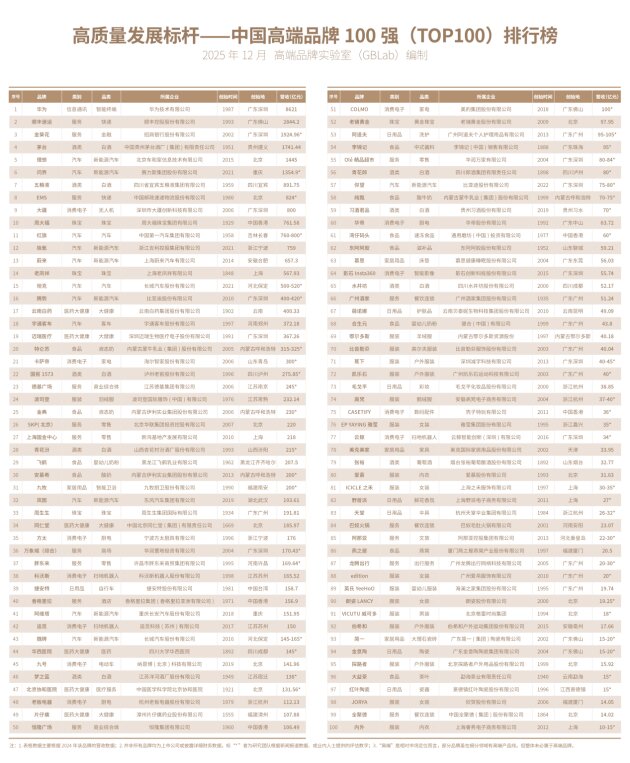 提要:最近,“中国高端品牌100强排行榜”重磅出炉。这份榜单跨度极大:既有华为、茅台、问界这样的千亿级巨头,也有卡萨帝、方太、九牧等百亿级中坚力量,还不乏仰望、云鲸、CASETiFY等十亿级新锐。表面看是品牌价值的排序,实则折射出一条清晰的进化主线——中国高端品牌的内核,正从符号、故事、情怀,加速回归到技术与产品本身。