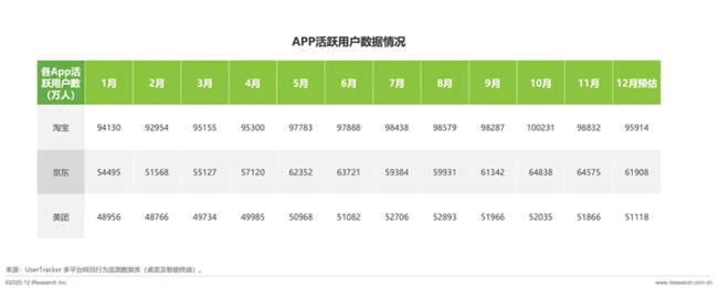 作为外卖市场格局的量化标尺,APP用户活跃情况直接反映平台真实运营规模与市场渗透情况。通过2025 年全年为监测周期、2024 年为基准对比,对三大平台APP追踪全链路用户行为与用户生命周期数据最终推总测算出 2025 年基于APP活跃用户情况的外卖市场份额预测。
