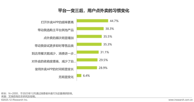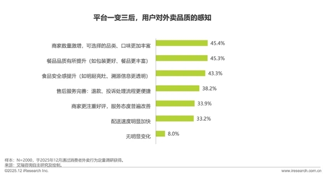 平台的竞争加剧使得行业全面提升质量,外卖消费环境实现显著改善。45.4%的用户感知商家数量激增,供给选择愈发丰富;45.3%的用户认可餐品品质有所提升、43.3%的用户反馈食品安全感持续增强。同时,多维度的服务进一步强化了这一消费趋势,33.9%的用户感受到商家更注重好评、售后服务更完善,33.2%的用户感受到配送速度明显加快;用户感知的供给、品质、安全、服务、配送得到了多维度优化,平台也正在从单一优势转向全链路综合服务能力。