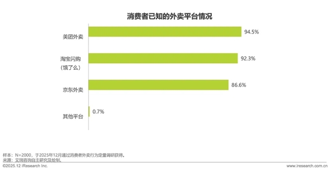 三大平台市场认知度均处于高位水平,美团凭借多年行业积累使平台以94.5%的认知率领先,淘宝闪购(原饿了么)紧随其后达92.3%。京东外卖作为后入局者仍实现86.6%的高认知渗透,印证其渠道铺设与平台推广的高效。三平台形成全民级品牌覆盖。