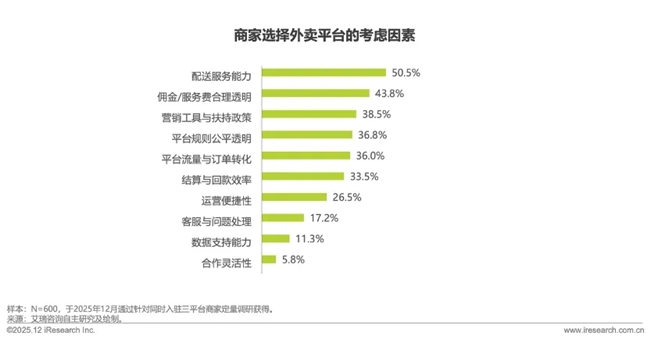 与此前价格补贴主导的竞争不同,商家选择平台的核心逻辑已转向价值维度,调研显示,“配送服务能力”以50.5%超半数居于高位,其次是“佣金/服务费合理透明”(43.8%)、“营销工具与扶持政策”(38.5%)。单纯的补贴力度已褪去核心决策指标。