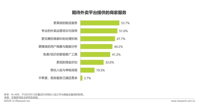 全平台入驻的600个商家中,“更高效的配送服务”以53.7%的占比高居需求榜首;证明市场对履约效率的要求仍在提升,尤其是在订单高峰时段的配送稳定性,已成为商家评估平台服务的核心指标。其次“专业的外卖运营培训与指导”(51.0%),凸显中小商家渴望提升线上运营能力、优化订单转化的迫切性;此外“更完善的商家纠纷处理机制”(47.7%)、“更精准的用户画像与数据分析”(44.2%)“免费/低价的营销推广工具”(41.2%)的需求占比均超四成,成为商家数字化运营的关键点。值得关注的是,“更低的佣金折扣”仅以32.0%的占比位列倒数,印证基础价格补贴已不再是平台吸引商家的核心竞争力。