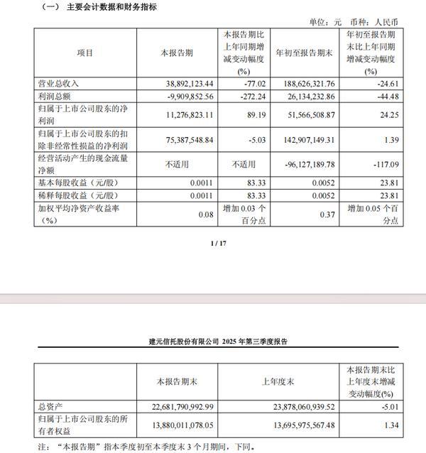 今日,建元信托(股票代码:600816.SH)公布三季报显示,2025年1-9月,建元信托实现营业总收入1.89亿元(188,626,321.76元),同比下降24.61%;实现归属于上市公司股东净利润5156.65万元(51,566,508.87元),同比增长24.25%;归母扣非净利润1.43亿元(142,907,149.31元),同比增长1.39%。截至三季度末,建元信托总资产达226.82亿元(22,681,790,992.99元),较上年末下降5.01%。