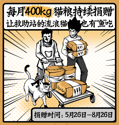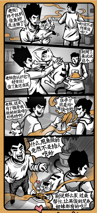 一向擅长用漫画讲故事的太二,这次也为猫粮创作了相关IP和起源故事:一只带有“二”字花纹的流浪猫首领,在太二门店偷鱼行动中,为了掩护其它流浪猫逃跑,被店员抓住,“二老板”欣赏它临危不惧,爱护弱小的英勇举动,于是取名“何英俊”,并诞生了制作公益猫粮的想法。