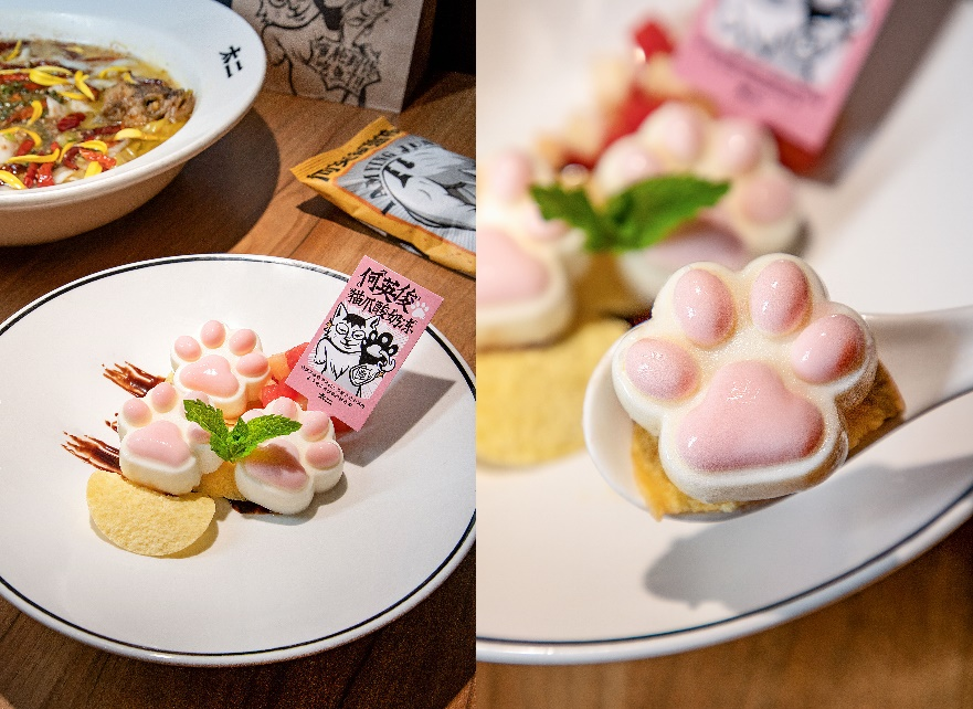 同时,太二还推出公益主题菜“猫爪酸奶冻”,并以IP何英俊的名字命名,在全国270+门店上线售卖。每售出1份主题菜,太二将捐出1.22元给中国小动物保护协会,用于流浪猫绝育及医疗救助。