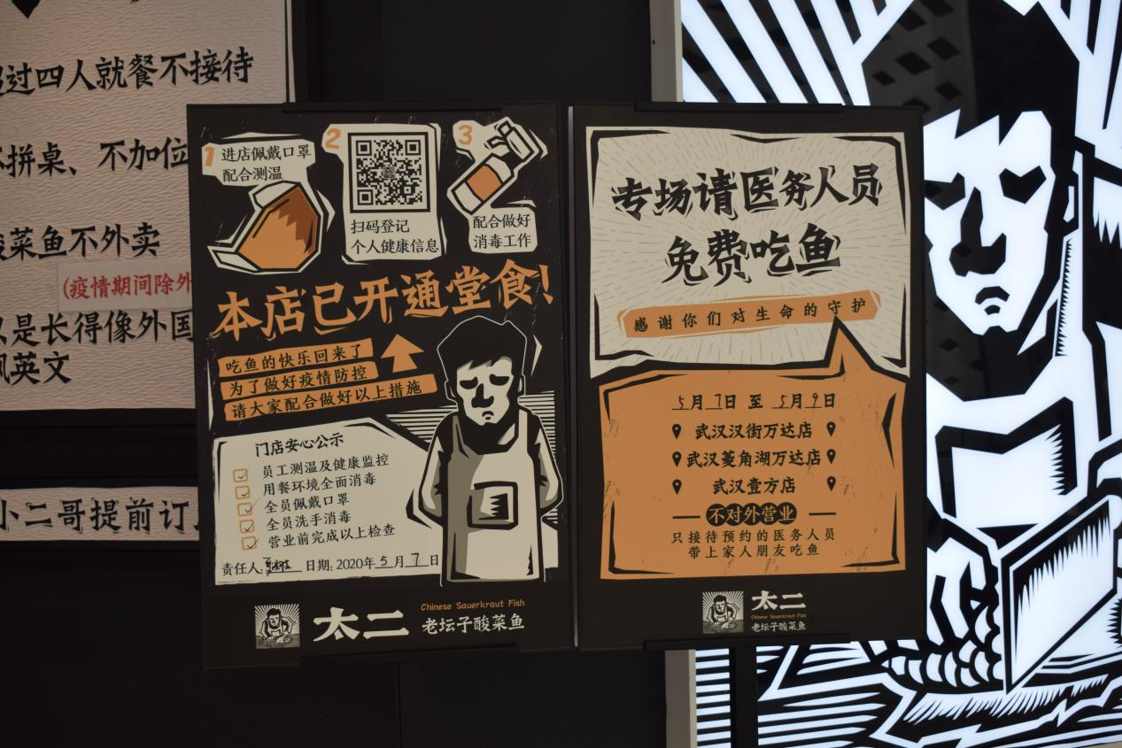 2020年初武汉疫情的爆发,牵动着无数人的心。5月疫情平缓后,太二在武汉开设了“医务人员免费吃鱼专场”,武汉所有门店三天不对外营业,邀约守护武汉的英雄们带上亲朋好友来店里免费吃鱼。