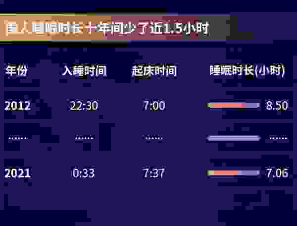 具体而言,相比于十年前,国人入睡时间晚了2个小时,起床时间晚了37分钟,日均睡眠时长少了近1个半小时。64.75%的被调查者每天实际睡眠时长不足8小时,超过8小时的比例仅为7.97%。同时,超3亿人出现了睡眠障碍。