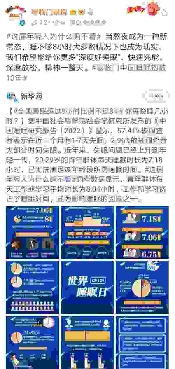 当天,“专家建议晚上10点到11点睡觉”“全国睡眠超过8小时比例不足8%”等话题为网友热议,累计阅览量破千万,综合阅读次数超过17亿人次,短短3天,包揽18个热搜。
