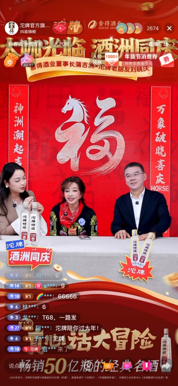 在“T68真心话大冒险”组合式social事件引发广泛情感共鸣后,1月31日,沱牌邀请刘晓庆、舍得酒业董事长蒲吉洲在抖音“沱牌官方旗舰店”重磅开启“酒洲同庆”直播,乘势将品牌热度转化为销售势能。