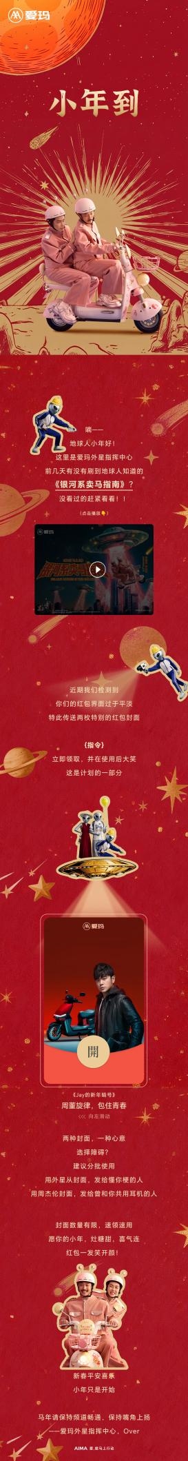 小年纳福,年味渐浓,当街头的红灯笼次第亮起,当新春的期盼悄然升温,爱玛2026马年CNY营销攻势也迎来重磅预热节点!值此除尘迎福、开启新春序章的美好时刻,爱玛官宣重磅惊喜——小年当日,不仅有《银河系卖马指南》专属红包封面限定发放,更携手品牌代言超过十五年的周杰伦,同步推出周杰伦主题《Jay的新年暗号》限定红包封面,以脑洞创意与代言人情怀双重加码,解锁新春第一份福气,联动全维度营销矩阵,为马年春节注入满满活力,邀全民共赴一场“金玛送福、热爱加码”的新春狂欢。