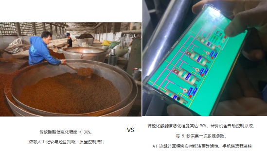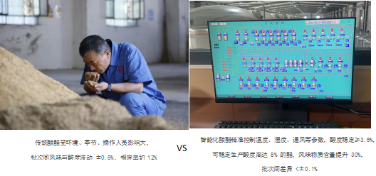 产品质量与稳定性的提升上,传统生产线信息化程度<30%,受多种因素影响,批次间风味与酸度波动 ±0.5%,产品报废率约 12%,质量追溯依赖人工记录、精度低;而智能生产线依托信息化程度高达 90% 的计算机全自动控制系统,每 5 秒采集一次温度、湿度、通风等多维参数,AI 边缘计算模块实时推演菌群活性,酸度稳定≥3.5%,更可稳定生产酸度高达 8% 的高品质食醋,批次间差异<±0.1%,风味物质含量提升 30%。同时智能生产线实现全流程数据记录,从原料到成品的每个环节均可精准追溯,更支持区块链溯源系统对接。