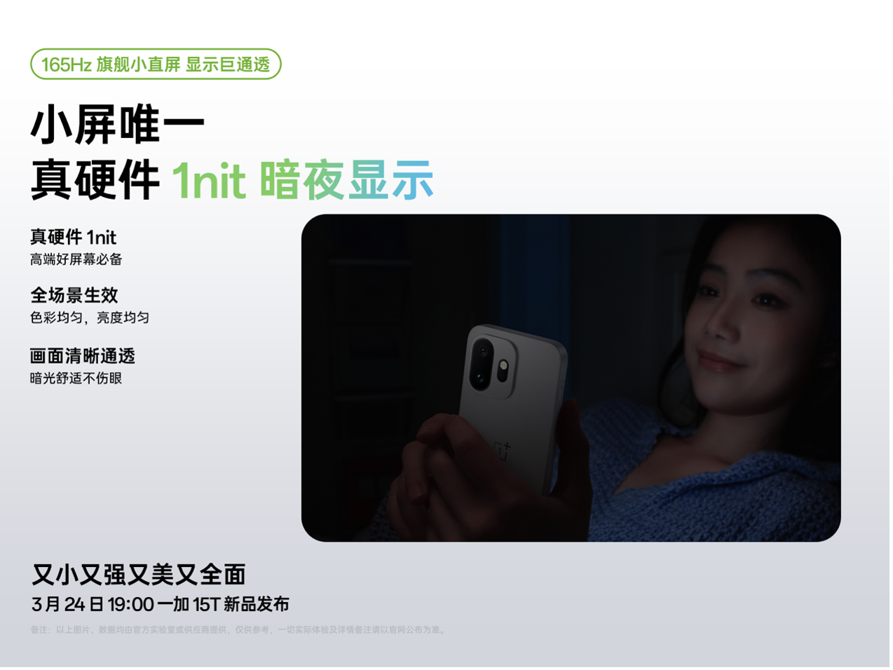 3 月 23 日,一加宣布全新小屏旗舰一加 15T 将搭载 165Hz 旗舰小直屏,首次为小屏用户带来超流畅的 165Hz 超高刷体验。该屏幕经「自研屏幕科学产线」二次校准,拥有「真硬件 1nit 暗夜显示」与全新「明眸护眼」等多项屏显黑科技,并获得小屏旗舰唯一「小金标」护眼认证,在流畅度、显示素质、暗光显示、护眼能力四大维度全面升级,引领小屏屏显体验大换代。