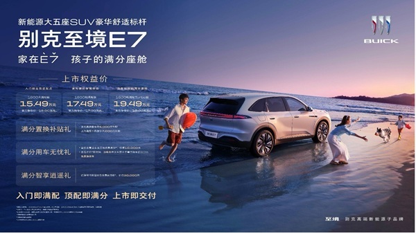 作为深度聚焦中国成长型家庭需求的新能源大五座SUV,别克至境E7以儿童成长需求为产品研发原点,将满分守护、满分松弛、满分探索融入出行全场景,打造孩子的满分座舱,新车累计订单已突破30000台,本次正式上市置换权益价为15.49万元—19.49万元。