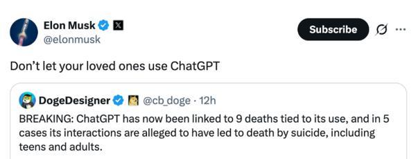 当地时间1月20日,特斯拉CEO埃隆·马斯克(Elon Musk)在社交平台X上对OpenAI发起了最新一轮“攻击”。他转发了一条称自2022年ChatGPT发布以来已导致九名儿童和成年人死亡的帖子,并写道:“别让你爱的人使用ChatGPT。”