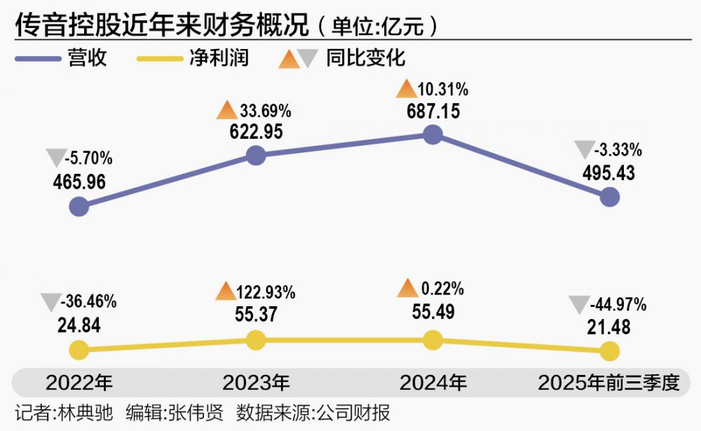 这一数据直观体现在公司的业绩报表上。今年前三季度,传音控股营收495.43亿元,同比下降3.33%;归母净利润与扣非净利润分别为21.48亿元和17.31亿元,同比分别下降44.97%和46.71%,近乎腰斩。