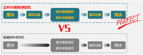 就安全性而言,与其他普通即热饮水机不同,立升D5即热饮水机可谓是净水器+即热水机的合体,依托立升净水在净水领域的突出技术,其过滤性能对比同类产品也是过之而不及——D5采用双芯四级精滤技术,重金属去除率达99%、细菌去除率达99.99%,安心直饮;其中的专利RO膜滤芯结构,以纯水浸泡和冲洗,降低膜内TDS值,不仅能减少RO膜表面结晶,还能延长滤芯使用寿命。