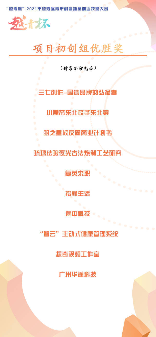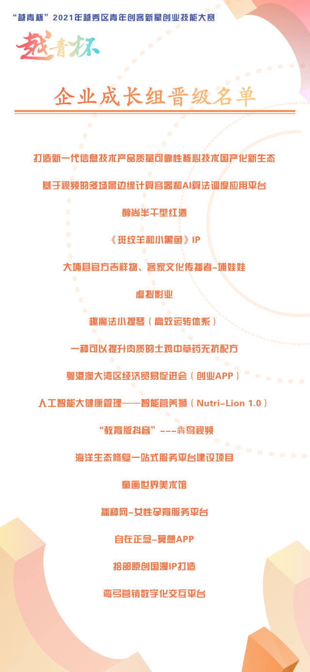 在报名参赛的300多个项目中,评审出企业成长组及港澳台专项赛多个优秀项目进入复赛环节,评选出项目初创组获得优胜奖的优秀项目。现将晋级企业成长组复赛、获得项目初创组(优胜奖)的项目名单予以公示。名单如下: