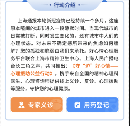 此次公益行动,上海市精神卫生中心特别组织了数十人的精神科医生队伍,携手来自好心情心理服务平台全国的精神心理科医生共同提供在线义诊服务,为广大上海市民的心理健康保驾护航。