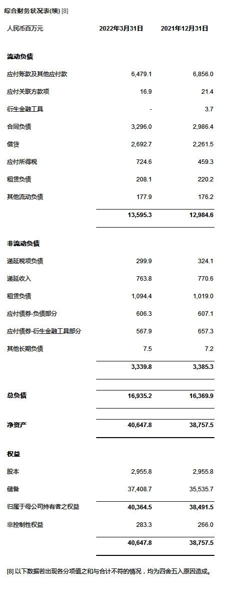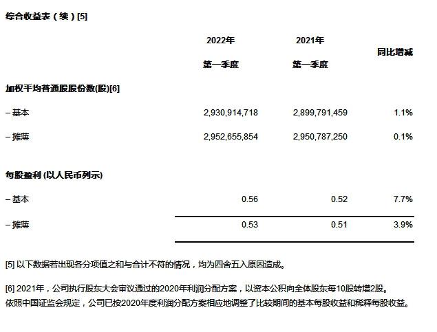 | [2] 2021年1-3月和2022年1-3月,公司稀释加权平均普通股股份数分别为2,950,787,250股和2,952,655,854股。 |