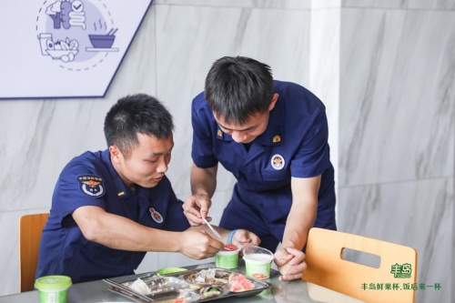 “我的这杯里面的柚子很好吃,你要不要尝尝看?”中午用餐结束后,消防员们聚在一起品尝丰岛鲜果杯,时不时还会交换尝一尝对方的口味,“吃完饭后来一杯丰岛鲜果杯,简直就是解腻消暑的利器,今天的维生素摄入也达标了”,一名消防员满意地说。