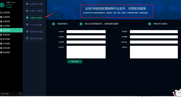 如今许多行业都面临着转型和改变,陈旧的传统营销已经不够用了,要想把产品销售到国外,需要了解国外客户寻找信息的主要途径,制定全套的营销方案,广泛地推广自己的产品。但市场上做外贸的企业不断增多,这么多企业供选择国外客户又为什么要选择您?如何提实现谷歌SEO排名快速提升?……在这里我隆重推出万单哥谷歌获客、谷歌商家挖掘、谷歌SEO营销、谷歌B2B霸屏功能板块,帮助企业实现谷歌SEO排名优化,让全球买家都能搜到,将产品展示给客户,一站式帮助外贸企业实现出海盈利。