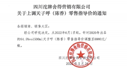 此外,舍得酒业还发布了《关于上调天子呼(陈香)零售指导价的通知》,针对2020年出品的64.5度1500ml天子呼零售指导价调整至6980元/瓶。