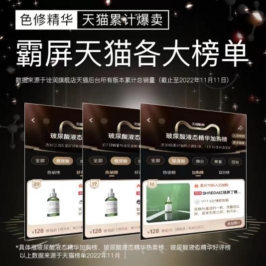 诠润天猫2022年突破了固有的营销壁垒,以消费者需求为中心,实现整合营销协同,将流量与用户连接起来,驱动高效转化,双11开售半小时销售额破百万,12项榜单强势刷屏,年度销售额同比增长近一倍,远超行业平均水平。