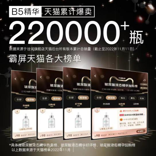 诠润打造2+N渠道模式的立体销售体系,天猫、抖音双渠道并驾齐驱双发力,蓄力破圈,开辟新局;同时发展拼多多、京东、唯品会等其他销售平台,搭建全渠道、立体化销售体系,领跑新渠道抢占先机。在多渠道新流量加持下,诠润B5修护保湿精华实力领跑,占领细分品类市场No.1,创造全网累计爆卖1000000+瓶的销量神话!