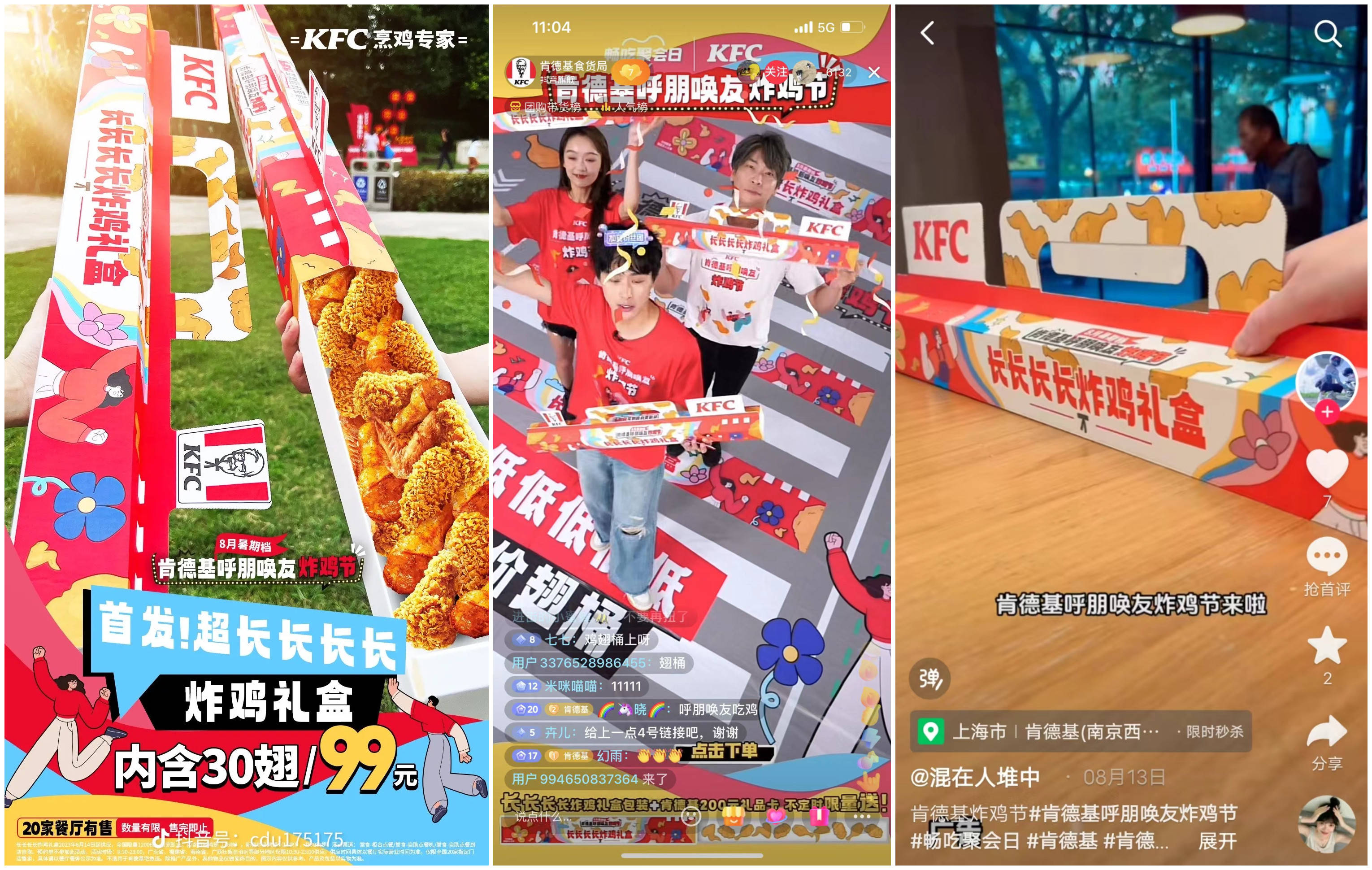 就在刚刚过去的这个暑期,肯德基创新打造首届「呼朋唤友炸鸡节」,联动抖音生活服务「畅吃聚会日」,全网组局“嘿伙计!一起拼!”,为网友们提供“好吃、好玩、好看”的聚会方案:加码聚会专属货品,全新上架“20翅2桶”,畅吃首选;限时开售“超长长长长炸鸡盒”,潮酷炸街全城心动,极速破圈;“超头+品牌+明星”全程接力直播,全面拥抱细分人群,拉动转化。「肯德基呼朋唤友炸鸡节」与「畅吃聚会日」的强强联合,助力品牌8月成为抖音生活服务餐饮行业当月支付GMV第一,经典品“20翅2桶”热销200万单。