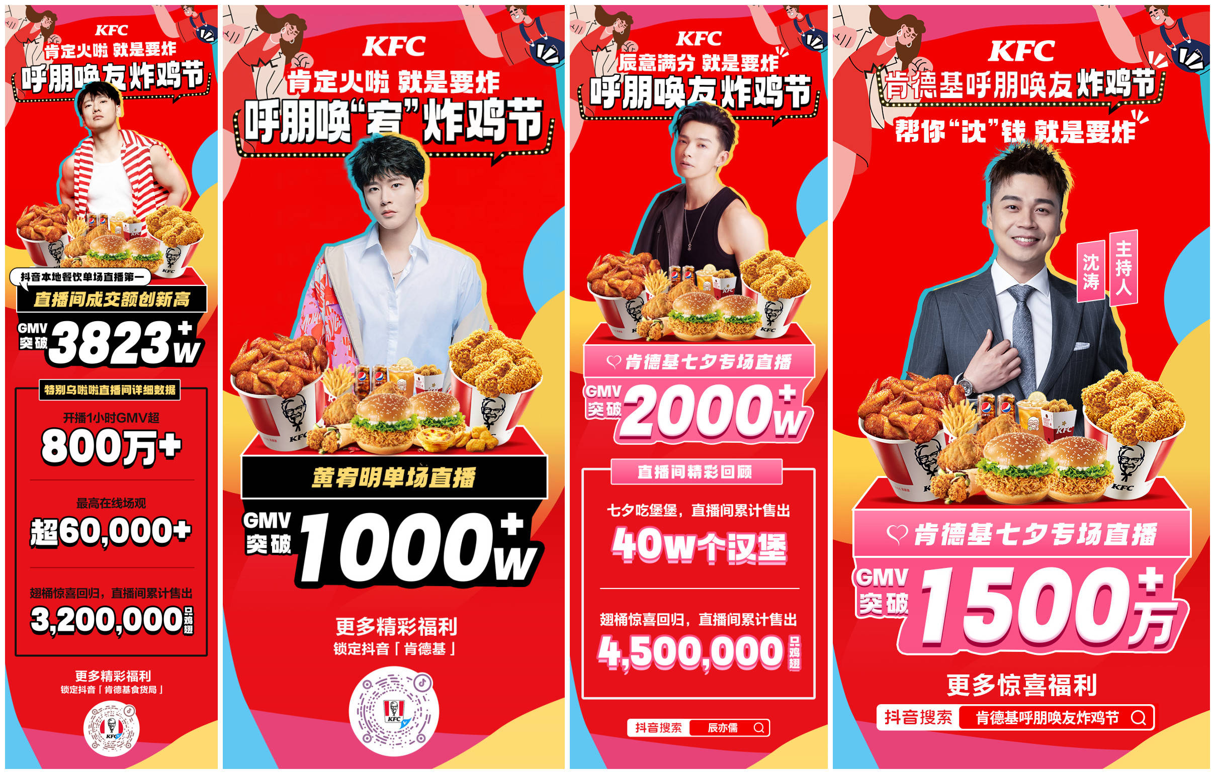 在「呼朋唤友炸鸡节」活动全程,肯德基也身体力行地“呼朋唤友”,与@黄宥明、@辰亦儒、@沈涛、@交个朋友等共同为炸鸡狂欢输出亮点。8月12日,肯德基牵手暑期热播剧《莲花楼》主演@黄宥明,开启“呼朋唤‘宥’炸鸡节”,为剧粉贴心安排“20翅2桶”等聚会小食,渗透粉丝圈层,分享剧情的同时共享美味。七夕热门节点,「肯德基呼朋唤友炸鸡节」借由合作好友精准触达目标人群,@辰亦儒 是自带暖男属性的“中国台湾偶像剧代表”,在直播间发起“七夕吃堡堡”甜蜜号召,吸引情侣CP下单,单场售出超过40万个汉堡;@沈涛 作为新晋奶爸,通过“帮你‘沈’钱”的性价比策略,辐射家庭人群,通过高折扣王牌产品拉动下单,单场GMV突破1500万元。