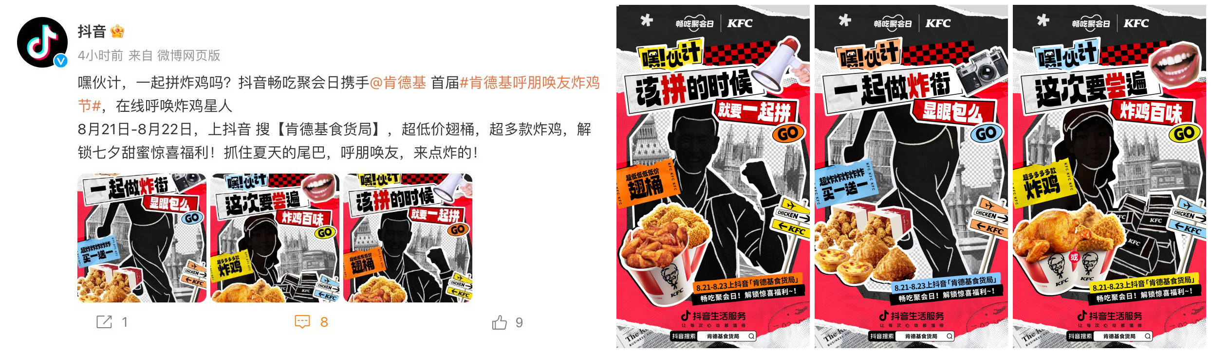 毫无疑问,「肯德基呼朋唤友炸鸡节」通过“货盘+IP+内容”成功在这个暑期掀起了一场“炸鸡大流行”:以“暑期节点+聚会场景”为诱因,营造欢聚休闲情绪;打造主题化的折扣货品提供实用价值,满足公共性需求;策划“超长长长长炸鸡盒”等话题事件制造社交货币,引发全民关注;联动抖音生活服务,深度共创,持续丰富内容生态,让营销活动成为具有可看性和说服力的故事。