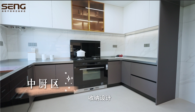 森歌不锈钢定制家居为一对年轻夫妇打造的婚房案例颇具代表性。整体采用了象牙白不锈钢门板,搭配创新的背墙系统,整个空间显得明亮又通透。西厨区域的中岛台设计,充分兼顾了操作的便利性;中厨运用了年轻人青睐的日式收纳,通过隐藏式收纳设计,保持了视觉上的整洁有序,高低错落的收纳设计严格遵循人体工学原理,有效中和了金属材质带来的冷硬质感。占地25㎡的中西厨大空间中,厨具碰撞发出的清脆声响与人们的欢声笑语相互交织,厨房彻底告别了以往孤独劳作的单一形象,而是成为情感交流与传递的社交中心。