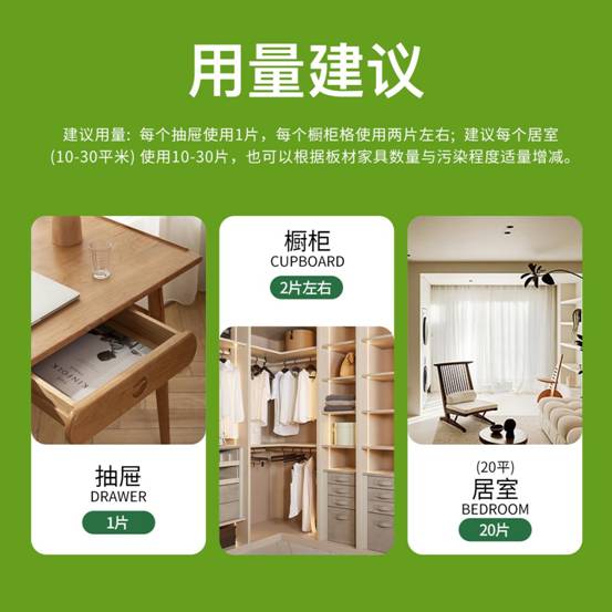用法用量:希泰晶活性锰一袋20片,适合20平米新房或者一辆新车使用。主要放置在衣柜,橱柜,书柜,客厅茶几,床头柜,梳妆台等抽屉使用。一个抽屉放置1-2片,一个衣柜格子放置2-3片,一个房间使用20片。根据自己家里情况直接横放或者竖贴都可以。