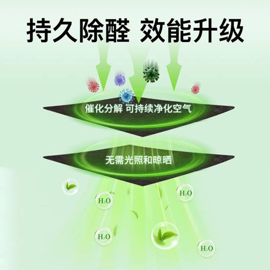 技术优势:无需光照、作用持久、避免二次释放(与传统活性炭吸附有本质区别)这项技术的突破性并非单一要素的结果,而是多个创新点共同作用的产物。“分解”而非“吸附”:这与普通活性炭只能物理“吸附”甲醛有本质区别。活性炭吸附容量有限,一旦饱和或环境温度升高,已吸附的甲醛又会重新释放出来,造成二次污染。而活性锰技术通过催化作用,从分子结构上破坏了甲醛,将其转化为无害的二氧化碳和水,这个过程是不可逆的,从而根除了二次污染的隐患。