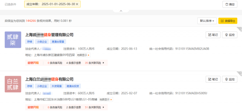 启信宝数据显示,全国与“健身”相关的公司,总数高达2,699,585家,光是今年上半年,新成立的健身相关公司就有144,266家!平均每天都有近800家新公司挤进这个赛道。