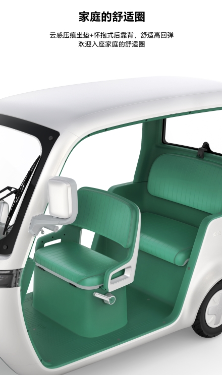 同时,作为“智慧安全家庭MPV”,在空间舒适性的塑造上,爱玛乐臻CA900追求向MPV级别看齐,前排驾驶位采用760mmX460mm零压云感坐垫配合环抱式后靠背垫设计,860X250mm外延加宽踏板保障双腿自然伸展,有效降低驾驶疲劳;后排乘坐位宽度达到800mm,配合920X360mm外延加宽踏板,确保两个成年人并排坐不会拥挤且腿部空间不逼仄,同时以环抱式后靠背围挡设计提升包裹感,有效降低老年人出行的劳累感。