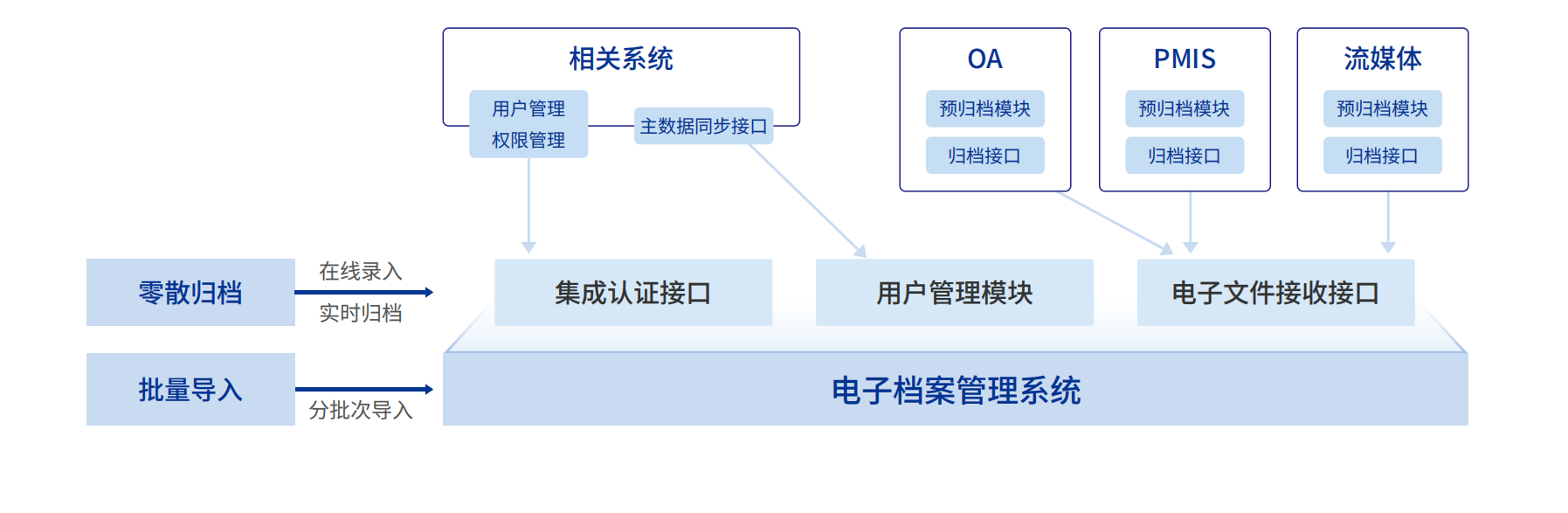 • 国内首批党政机关、企事业单位电子文件单套归档和电子档案单套管理试点支撑