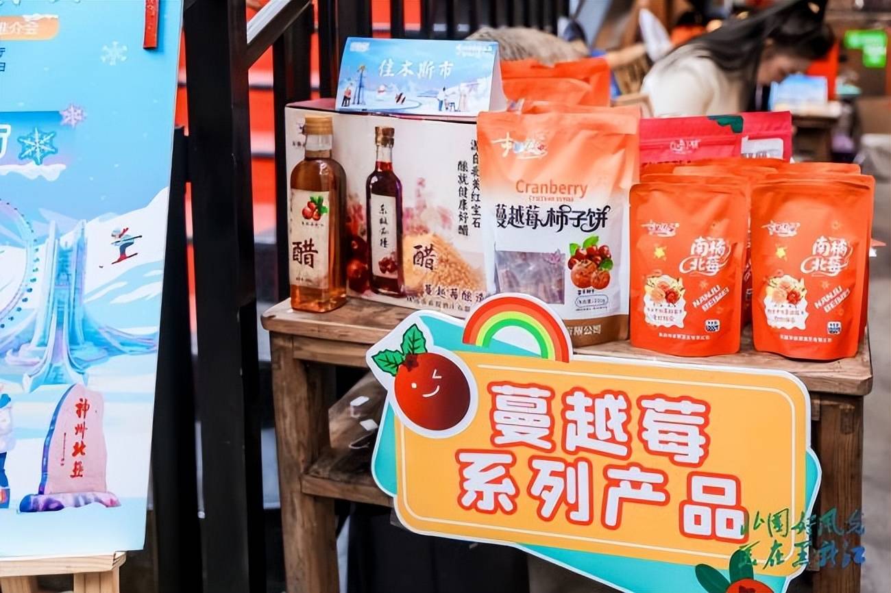 佳木斯展位以蔓越莓系列产品陈列吸引眼球,这些饱满红润的果实不仅象征着这片土地的富饶,也展示了当地现代农业的成果。两侧陈列着富有地方特色的鱼型抱枕、宣传画册、鱼皮制品、冰箱贴和吉祥物玩偶,展示了“华夏东极”的独特资源禀赋。