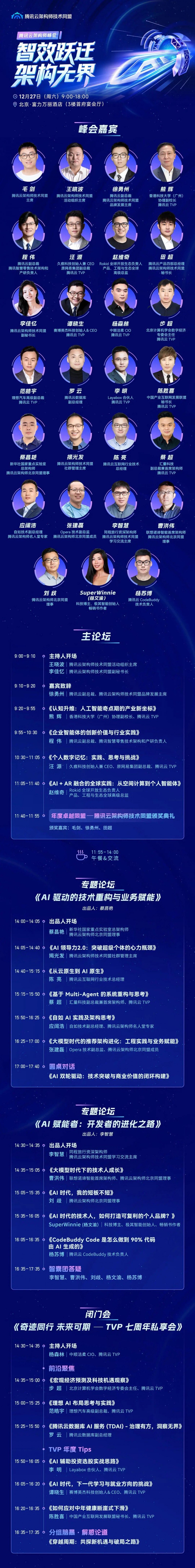 12 月 27 日,由腾讯云架构师技术同盟与腾讯云 TVP 联合主办的「智效跃迁,架构无界」腾讯云架构师峰会将在北京·富力万丽酒店盛大启幕。本次峰会致力于在岁末年初,为技术管理者与资深架构师校准 AI 时代的产业新坐标。