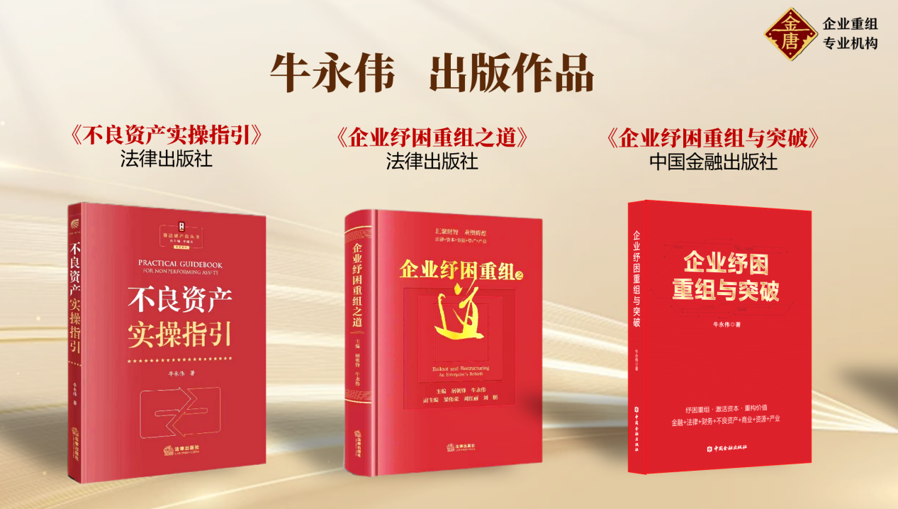 在此背景下,金唐企业纾困重组专业机构依托多年专业积淀,以法律为基、金融为翼、多领域协同,为危困企业搭建重生桥梁,践行“救企扶商、扶危济困”的使命担当。同时,团队出版了多本行业专业书籍,包括但不限于《企业重组与突破》(中国金融出版社)、《企业纾困重组之道》(法律出版社)、《不良资产实操指引》(法律出版社),并按照每年至少一本的精益求精态度和愿力去知行合一。
