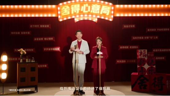 作为此次营销的核心内容载体,1月30日上线的《舍得表心意》创意TVC,在表现形式与创意表达上均展现出鲜明的亮点。该片以舞台剧为表现形式,跳出了传统白酒TVC的叙事框架,戴军和李静分别作为“舍得心意行动官”和“舍得心意主礼人”角色,以主持式互动串联全场,融入大量网感元素与喜剧桥段。