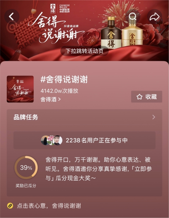 酒业家了解到,舍得酒此次还于抖音发起“舍得说谢谢”、“舍得表心意”话题挑战赛,激发消费者互动热情,形成社交话题扩散。同时,舍得酒在核心重点城市,布局户外写字楼、社区电梯媒体等线下媒介,覆盖核心人群的日常生活出行链路,实现新春品牌形象的饱和式曝光,让“春节表心意,舍得ZUI懂你”的主题深入人心。