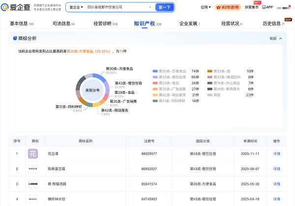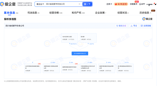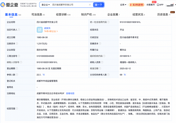 爱企查 App 显示,赖汤圆品牌关联公司——四川省成都市饮食公司成立于1980年8月,注册资本1231万元。对外投资信息显示,该公司对外投资包括成都市赖汤圆名特食品有限公司在内的4家存续企业。知识产权信息显示,该公司拥有包括包装袋(汤圆粉子)在内的5份专利;商标信息显示,该公司已申请注册包括“赖 熊猫汤圆”在内的200余份商标。