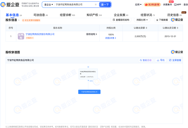爱企查App显示,缸鸭狗品牌关联公司——宁波市缸鸭狗食品有限公司成立于2012年1月,注册资本2000万元,由宁波缸鸭狗投资股份有限公司全资持股,经营范围包括食品生产、食品销售等许可项目。作品著作权信息显示,宁波市缸鸭狗食品有限公司目前已登记包括宁波汤圆在内的6项作品著作。