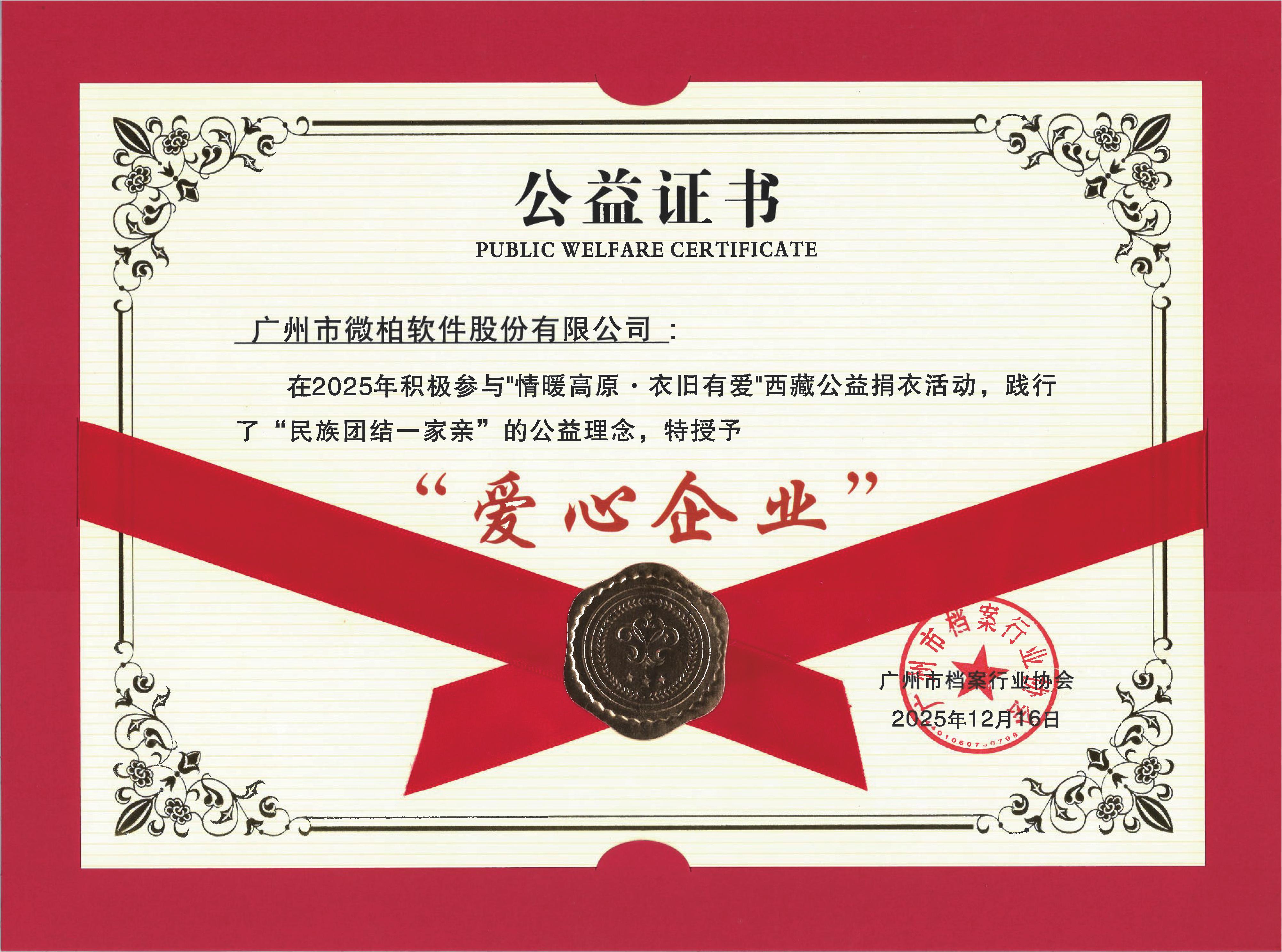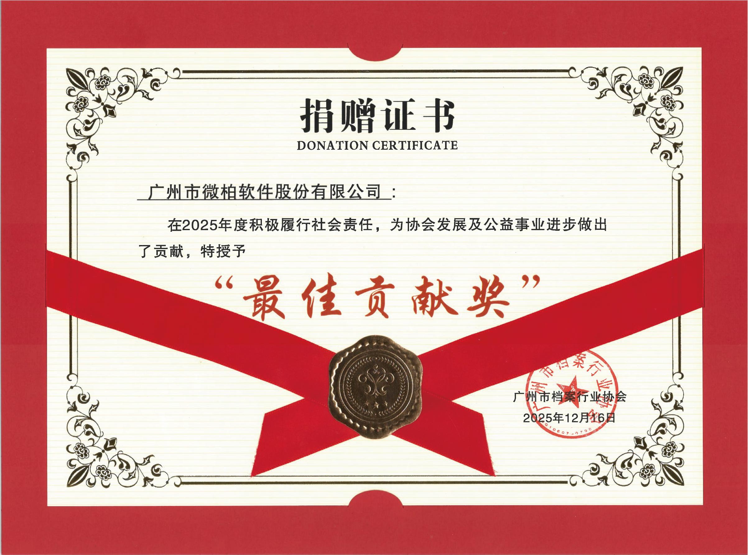 在追求专业发展的同时,微柏软件不忘履行社会责任,积极参与各类公益活动,被授予“爱心企业”称号并获得“最佳贡献奖”。