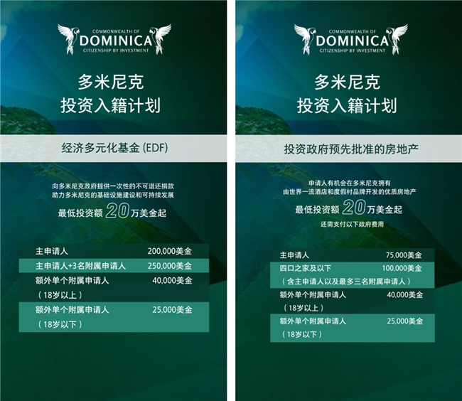多米尼克投资入籍计划成立于1993年,目前为投资者提供两种投资路径:一是向经济多元化基金捐款,资金直接用于国家基础设施建设、医疗教育提升等;二是投资经政府批准的房地产项目,包括高端酒店、生态度假村等旅游相关资产。两种投资选项的最低投资额均为20万美金。