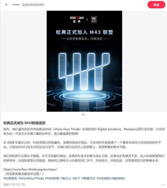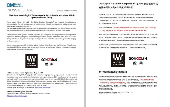 2026年2月12日,微4/3系统标准(Micro Four Thirds System)迎来了第63位成员。OM Digital Solutions Corporation宣布,深圳索达数码科技有限公司(以自有品牌“松典”运营)正式加入M43联盟,并将推出符合该标准的产品。这不仅是一则企业新闻,更是松典从“单打独斗”走向“生态共建”的标志性事件。
