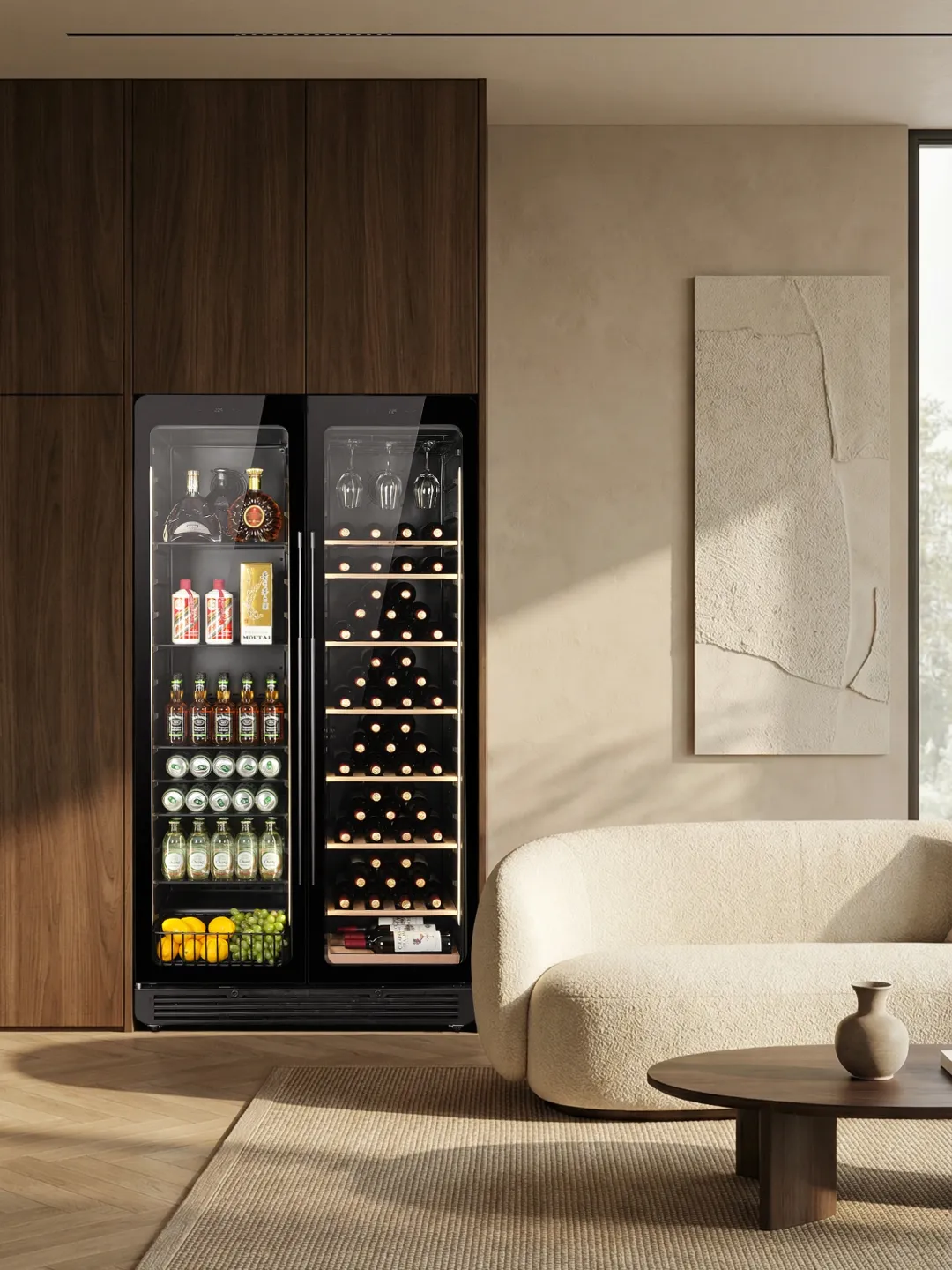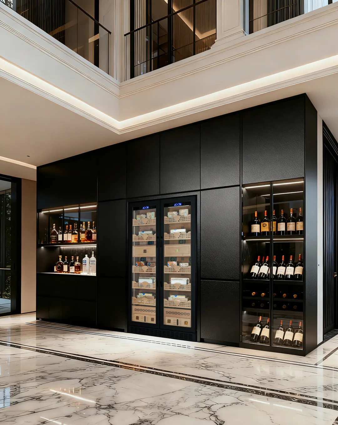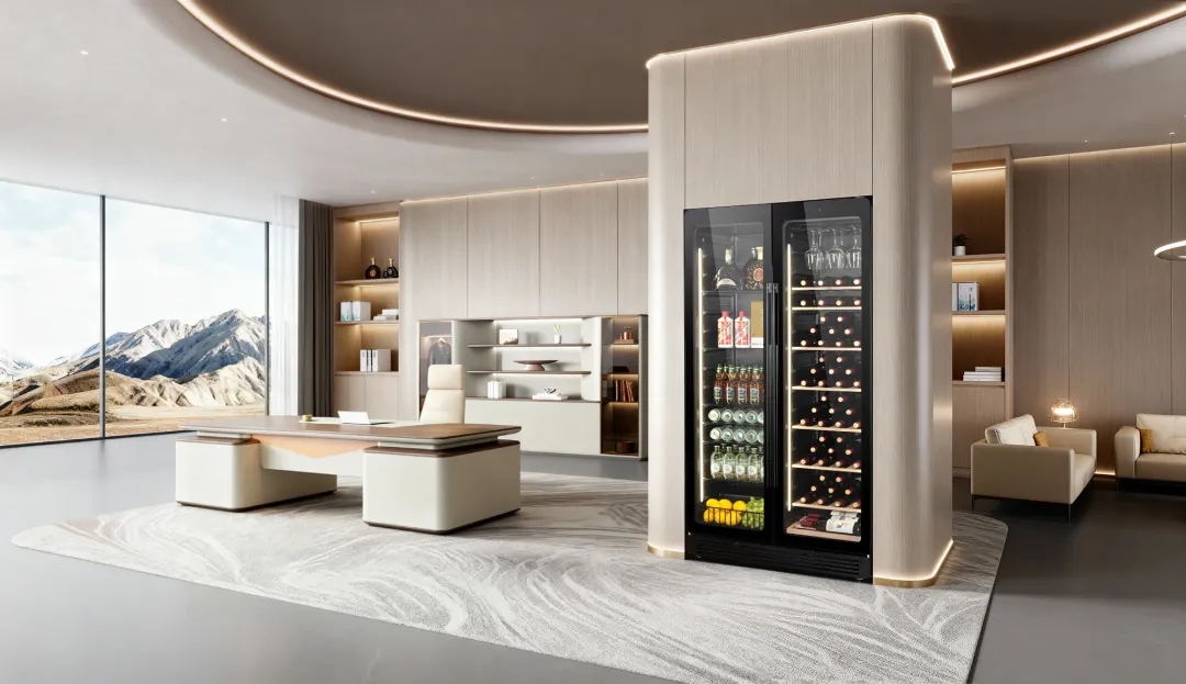而在行政酒廊这样的社交空间,HCK哈士奇红酒柜与雪茄柜的组合堪称“鉴赏家之选”。恒温恒湿的精准控制,确保每一支雪茄的醇香、每一滴红酒的口感都保持在巅峰状态,更以视觉上的陈列美感强化空间的奢享氛围。