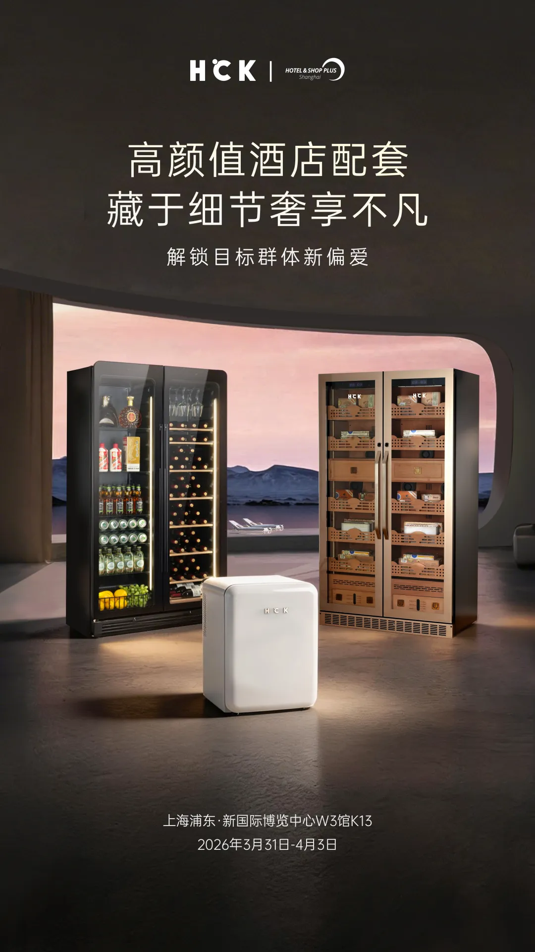 2026年3月31日-4月3日,上海新国际博览中心·浦东W3馆K13展位, 诚邀各界酒店业主、设计机构来到HCK哈士奇展位,亲身体验复古美学与前沿科技碰撞的火花,共同品鉴红酒的醇厚、冰饮的酷爽,以及酒店空间美学的更多可能。让我们在这场酒店业的年度盛会上,不见不散!