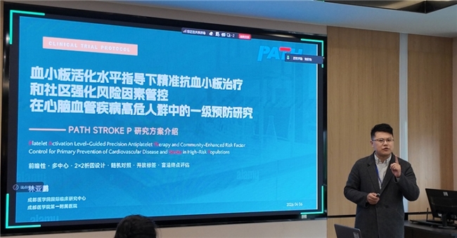 成都医学院国际临床研究中心副教授林亚鹏作为项目共同发起人,现场解读了双方核心合作项目——“血小板活化水平指导下精准抗血小板治疗及社区强化风险因素管控在心脑血管疾病高危人群中的血栓早筛与用药指导研究”(PATH STROKE P)。他指出,心脑血管疾病已成为威胁我国居民健康的重大公共卫生问题,血栓早筛是降低发病率的关键举措;而血小板活化水平作为动脉血栓形成的核心生物学标志物,在早期预警、风险分层中具有重要临床价值。该项目将通过多中心临床研究,验证新型检测技术的临床应用效能,为优化抗血小板治疗方案提供循证医学证据。
